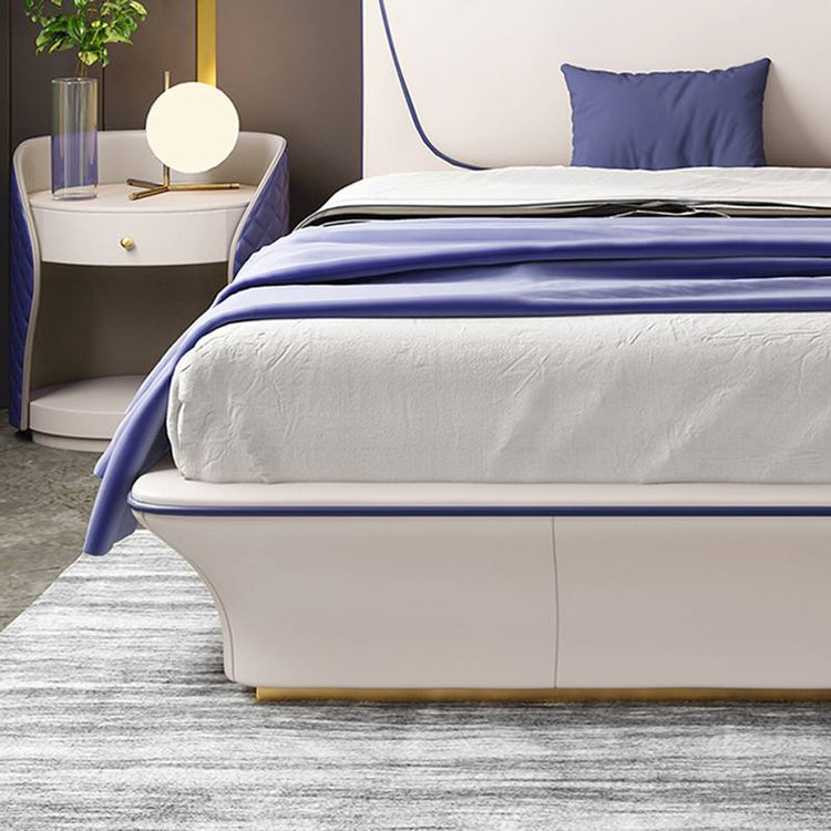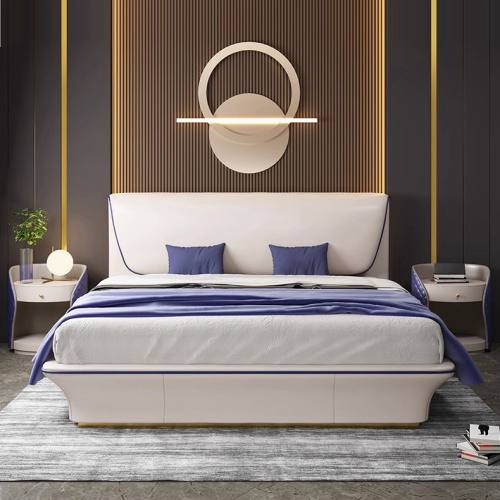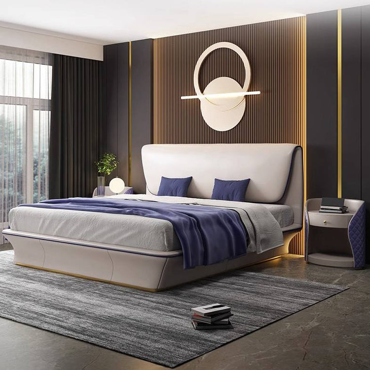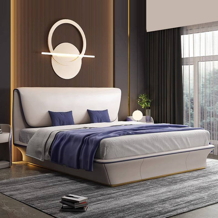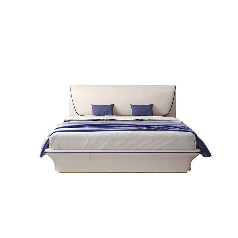 The Caldera Leather Bed blends sculptural form with serene sophistication. Its curved upholstered headboard, wrapped in smooth premium leather, creates an elegant visual flow that enhances any modern bedroom. The design is accentuated by refined gold detailing and a softly flared base, giving the bed a graceful, floating appearance.
