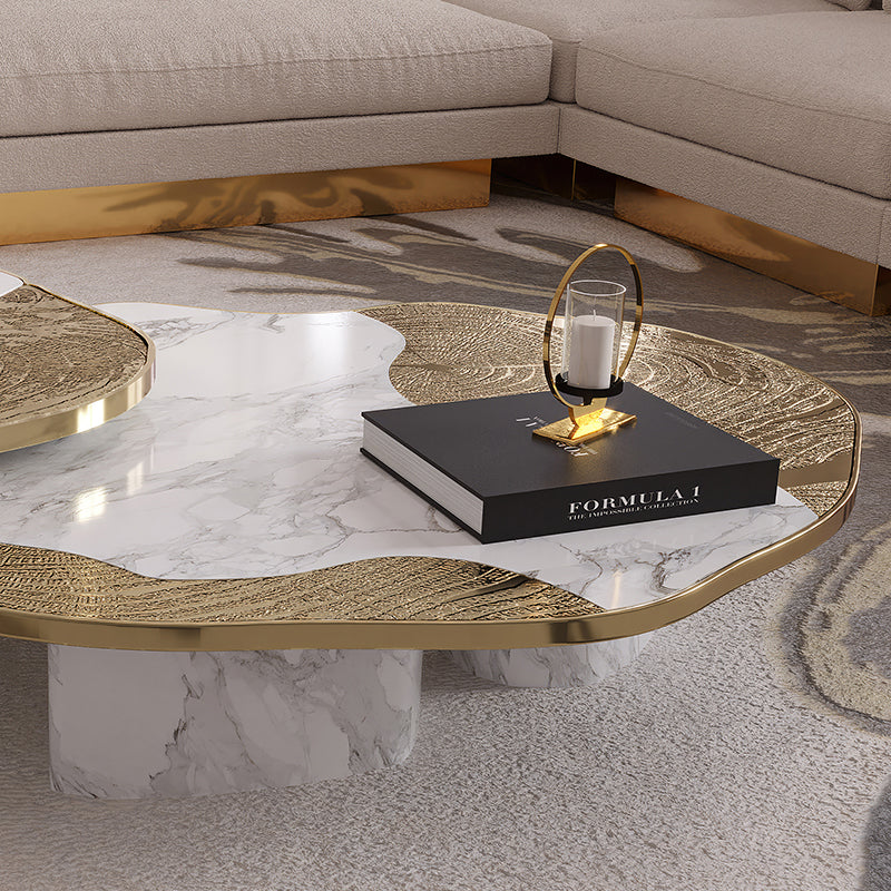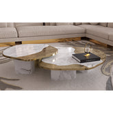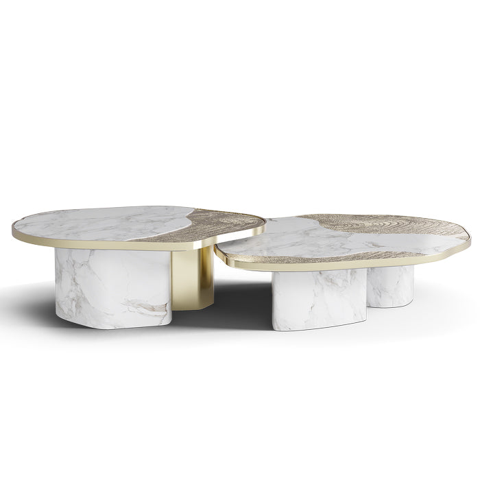 The Solenza Coffee Table Set redefines modern elegance with its seamless blend of polished white marble and radiant gold trim. Designed as a pair of nesting tables, Solenza adds both function and artistry to your living space.