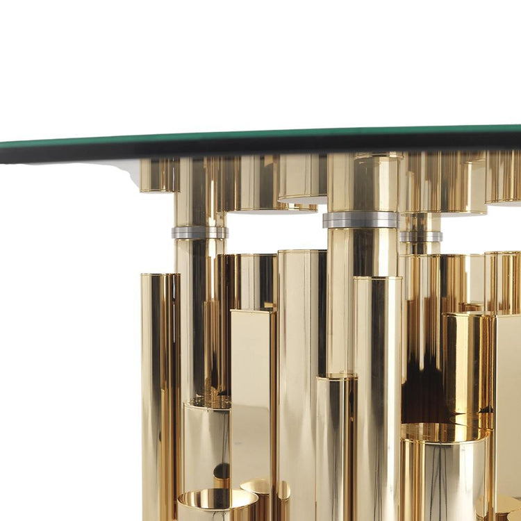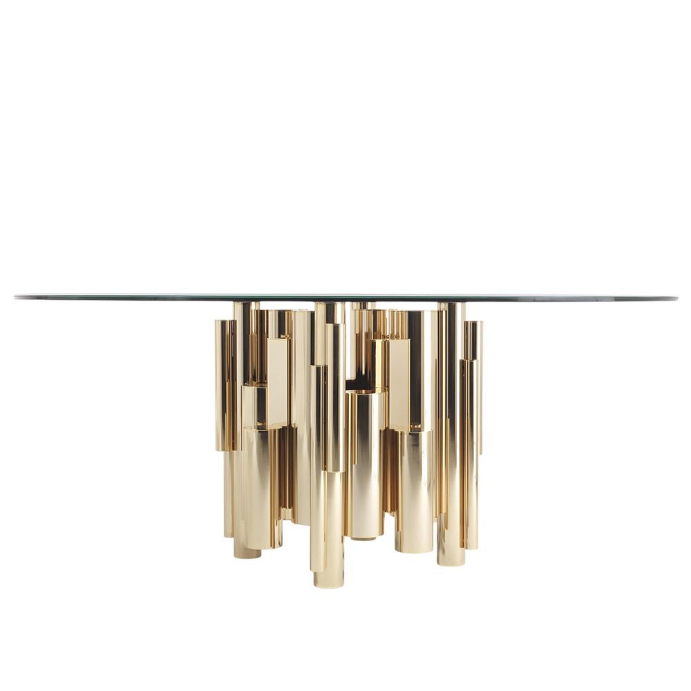 Designed for both aesthetics and strength, the thick tempered glass offers exceptional durability and scratch resistance. The architectural metallic base anchors the piece with a luxurious statement of balance and proportion. Whether paired with velvet dining chairs or minimalist seating, the Lucentia adds a touch of modern elegance and timeless sophistication to every meal.