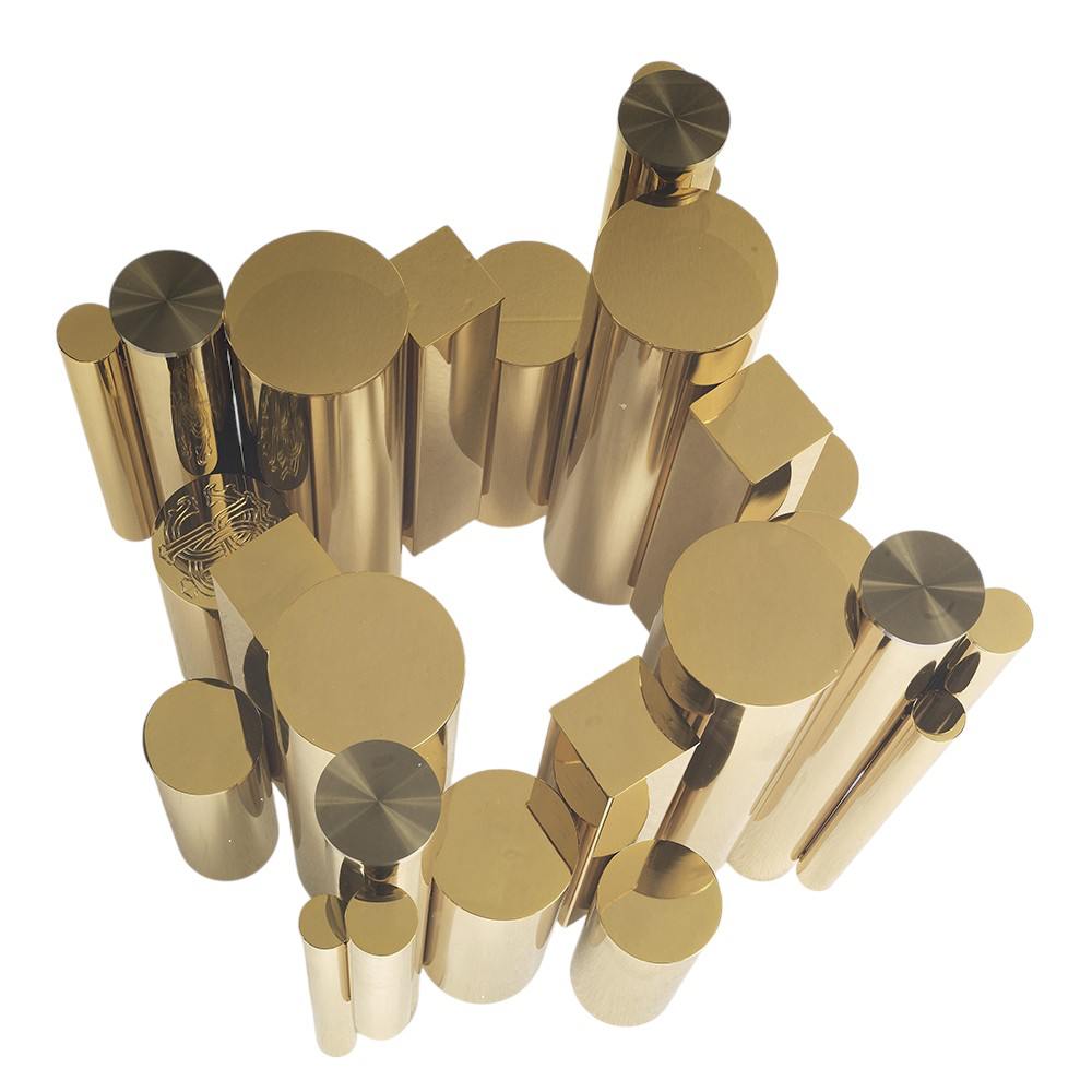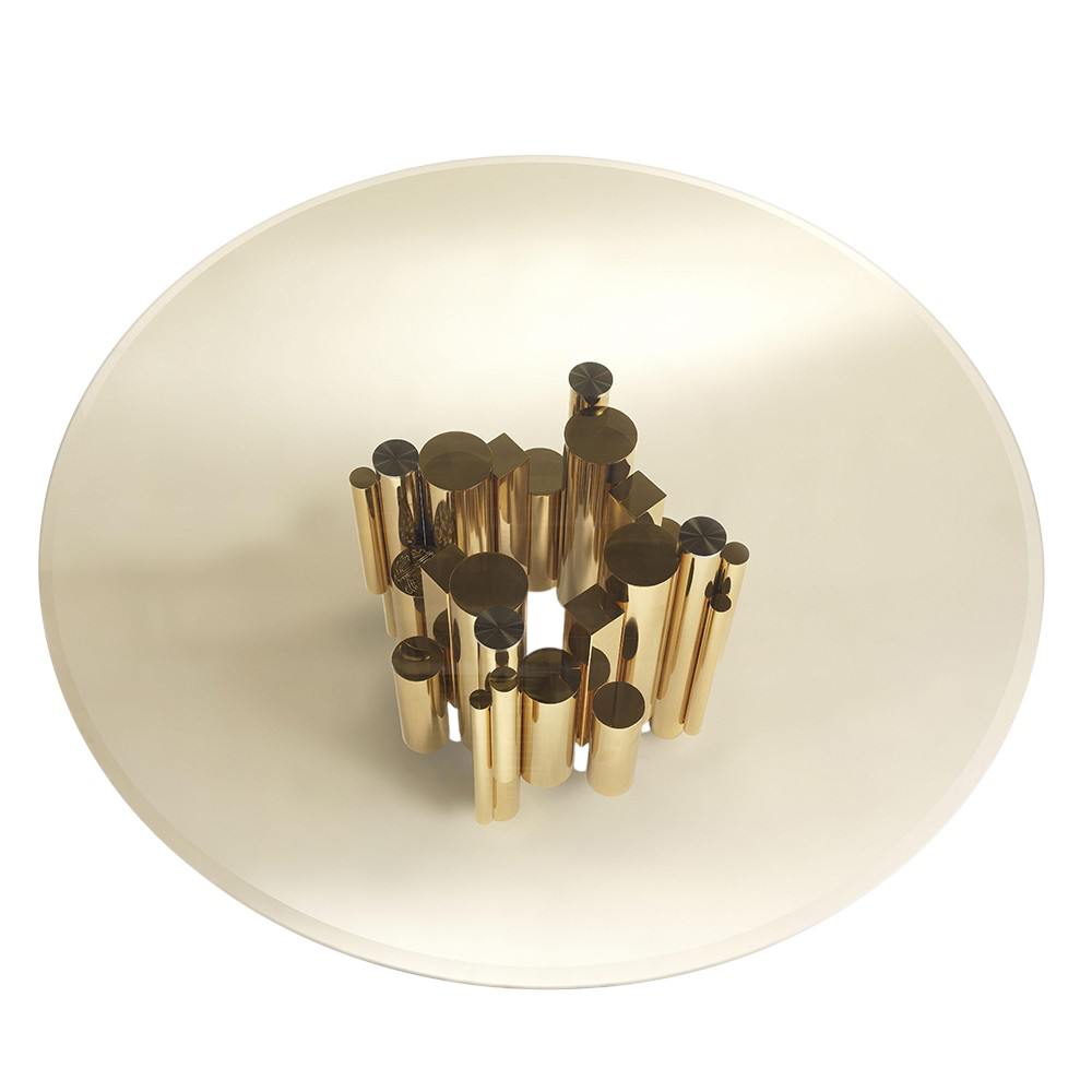 Sculptural metallic base in gold, silver, or black finish