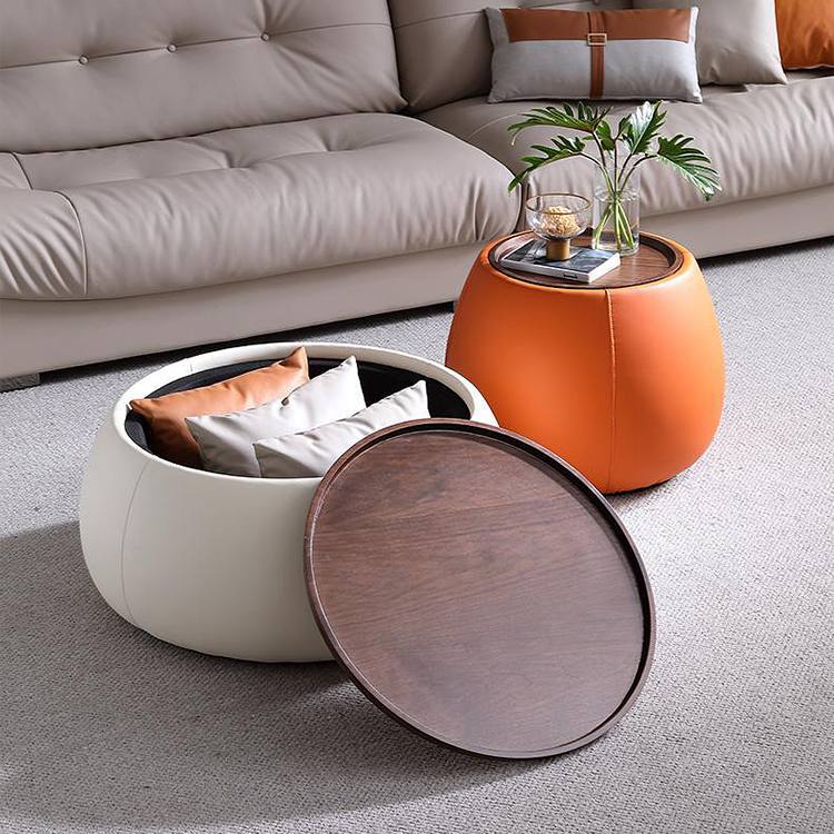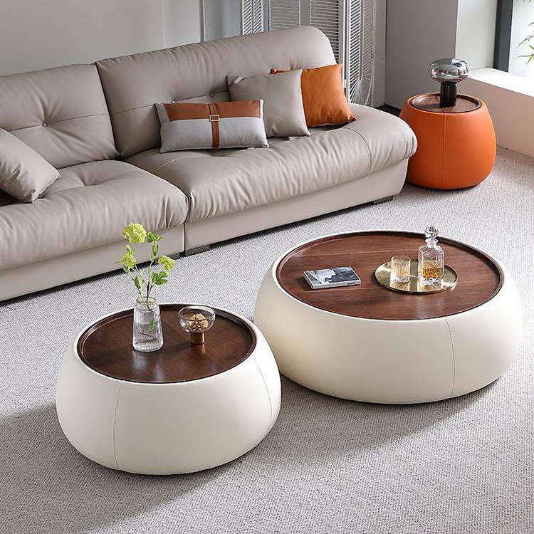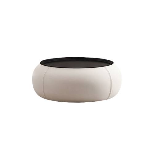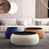 The Sovana Leather Storage Table blends refined craftsmanship with everyday functionality. Designed with a smooth, sculptural silhouette, this round coffee table features a supple leather exterior and a removable wooden lid that opens to reveal discreet interior storage.