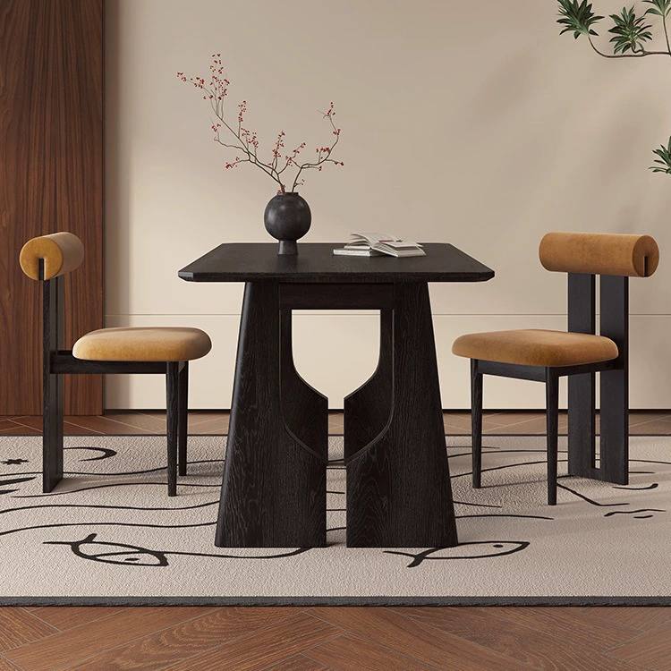 The matching chairs introduce a touch of softness with velvet-wrapped cylindrical backrests and plush seat cushions in rich ochre tones. Together, the clean geometry and rich textures create a dining experience that feels both modern and inviting.